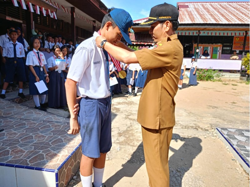 KARANGAN - Hari Senin, 6 November 2023 adalah salah satu hari yang paling membahagiakan bagi anak-anak di SMPN 1 Mempawah Hulu. Betapa tidak, bertempat di halaman SMPN 1 Mempawah Hulu, anak-anak menerima penghargaan atas beragam lomba yang telah diselenggarakan pada Hari Sumpah Pemuda serta Pelaksanaan National English and Science Olympic (NESO) 2023 yang lalu. Selaku Pimpinan, Bapak Aspan, S.Pd, memberikan apresiasi penuh kepada anak-anak karena berusaha dengan sepenuh hati mengikuti berbagai lomba tersebut. Hal ini didukung dengan pemberian sertifikat, medali dan piala serta uang pembinaan bagi anak-anak yang meraih predikat terbaik. Pada 4 cabang lomba utama yang diselenggarakan, total penerima hadiah adalah lebih dari 40 orang yang tergabung dalam grup maupun individu pemenang Lomba Perayaan Sumpah Pemuda ke-95 di SMPN 1 Mempawah Hulu. Adapun sebagai pembina OSIS, Bapak C.F. Yakub, S. Ag berterima kasih juga untuk semua yang terlibat, Kepala Sekolah, para dewan guru/staf, OSIS serta mahasiswa PLP II dari IKIP PGRI Pontianak. Terkhusus untuk OSIS dan Mahasiswa PLP II, banyak pengalaman yang mereka pelajari dalam penyelenggaraan acara ini. Beliau berharap bisa menjadi bekal soft skill mereka di masa mendatang. "Terima kasih atas dukungan Kepala Sekolah. Acara berjalan lancar, sesuai dengan rencana awal ketika rapat. Kegiatannya diikuti secara antusias oleh para murid", komentarnya. Beliau juga mengapresiasi para peserta yang mampu menunjukkan sisi terbaik mereka dengan antusiasme yang luar biasa. Harapannya, ini menjadi latihan untuk mengasah skil sosial para murid. "Walaupun sosialisasi lomba nya agak terlambat, tapi hasil persiapan penampilan mereka luar biasa!", ujarnya berbangga. Selain itu, SMPN 1 juga patut berbangga karena mendapatkan Medali Emas dan Trofi atas pencapaian Andreas Billy (kelas IX C) yang meraih predikat Golden Winner dalam National English and Science Olympic (NESO) yang diselenggarakan oleh Global House. "Tahun lalu kita dapat, tahun ini kita mendapatkan (juara) nya lagi!", ujar Bapak Aspan, S.Pd. Sembari memberikan Medali dan Uang Pembinaan, beliau mengucapkan selamat kepada pemenang, semoga bisa menjadi motivasi untuk menjadi lebih baik terus kedepannya. Andreas Billy merasa sangat senang bisa mendapatkan penghargaan ini. "Saya mengucapkan terima kasih kepada Bapak Kepala Sekolah dan Para Guru Pembimbing atas bantuannya untuk membina kami semua", ucapnya. Pada guru pembimbing dan semua peserta juga mendapat Sertifikat dari pihak Global House. Sertifikat diserahkan kepada setiap pembimbing oleh Bapak Aspan, S.Pd. Adapun peserta yang ikut jumlahnya lebih dari 50 orang juga mendapat Sertifikat sesuai dengan predikatnya masing-masing. (lou)
